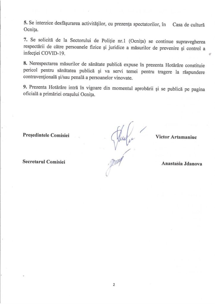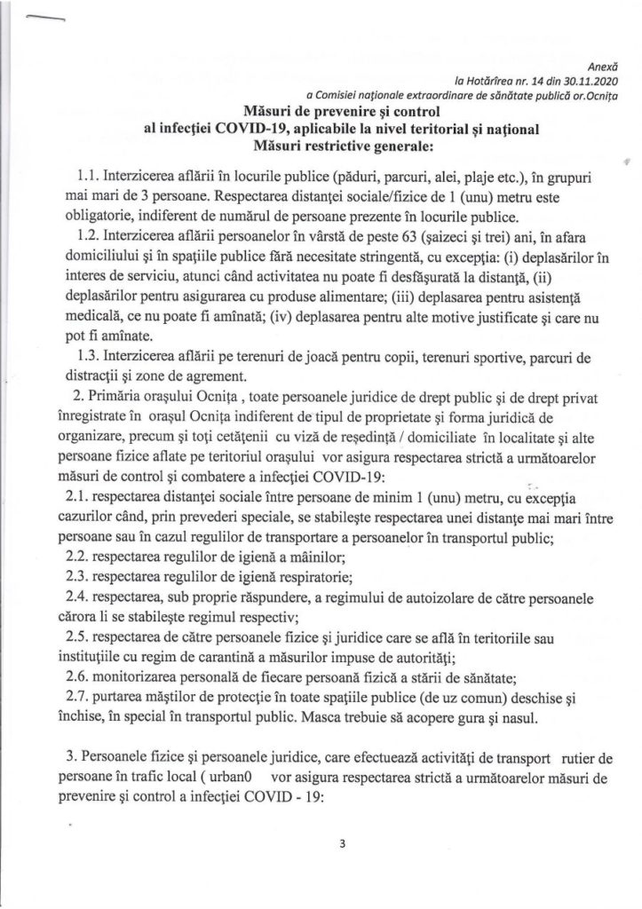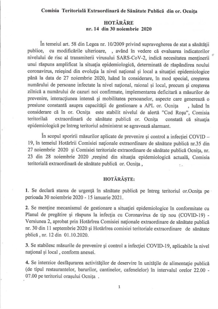 Comisia Teritorială Extraordinară de Sănătate Publică din orașul Ocnița, luînd în considerație creșterea numărului de persoane infectate, a constatat că situația epidemiologică pe întreg teritoriul administrat se agravează alarmant. În acest scop, se declară starea de urgență în sănătate publică pe perioada 30 noiembrie 2020 – 15 ianuarie 2021, care prevede respectarea mai multor măsuri de prevenire și control a infecției COVID-19, aplicabile pe întreg teritoriul RM.