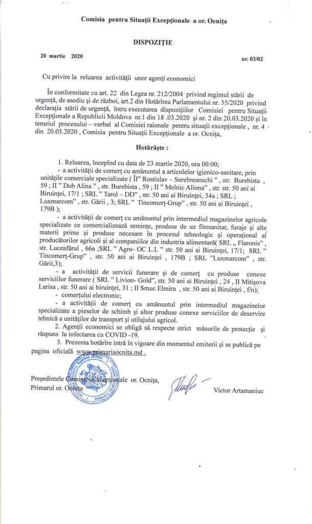 Stimați locuitori ai orașului Ocnița, vă informăm despre măsurile, întreprinse de Primărie, cu scopul de prevenire și diminuare a răspândirii virusului COVID-19 pe teritoriul orașului: